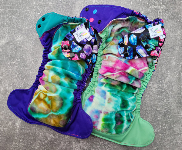 - One long soaker is attached with snaps to a PUL panel at the back of diaper. It consists of 1 layer of heavy bamboo fleece, and 2 layers of hemp/bamboo/organic cotton fleece(h/b/oc)